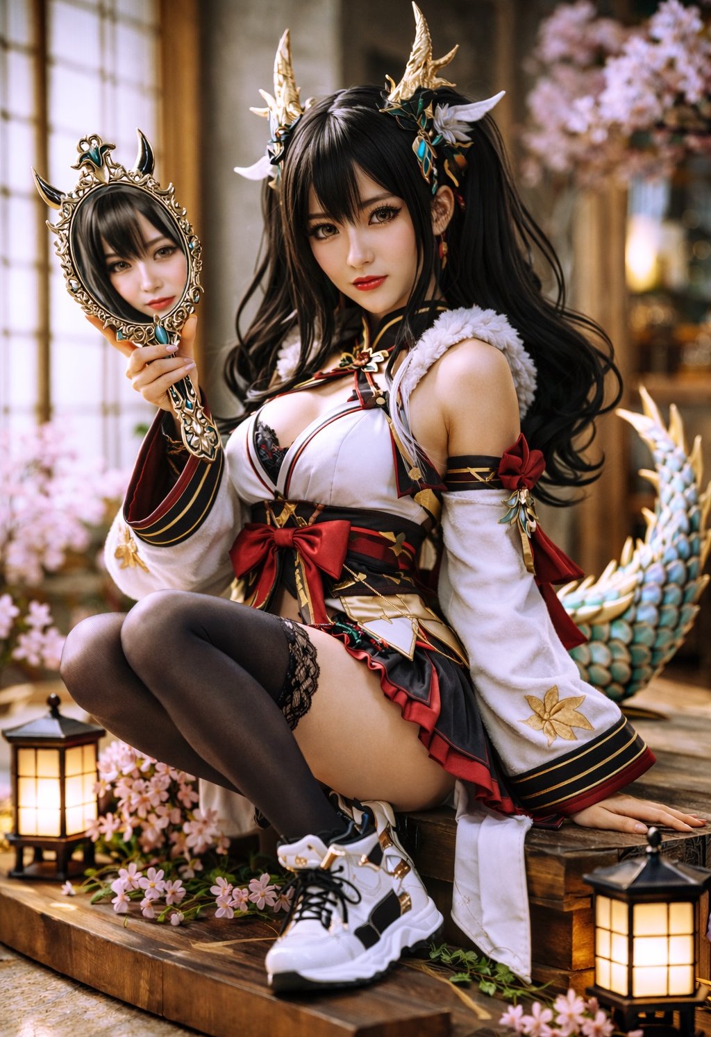 A dragon lady sitting casually, one knee up, wearing what looked like a modern festival outfit. Sneakers. Yes, sneakers. Tiny sculpted laces and all.