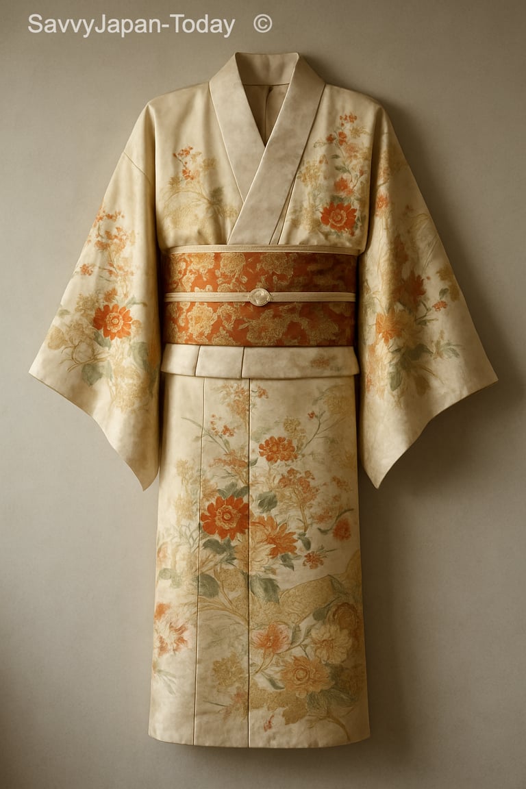So here’s the thing: this women's Japanese kimono — the one hanging so gracefully, the one with the soft cream silk and those delicate orange-gold floral patterns — it’s priced at $540,000.